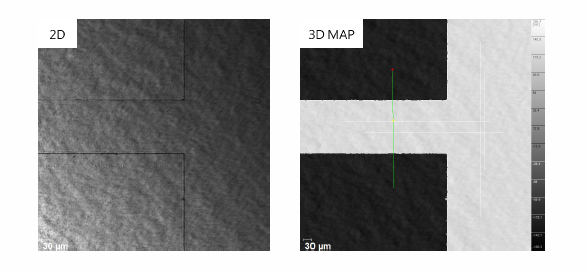 먼저, 2D 이미지와 3D Map의 출력 Data를 비교해 보겠습니다. 2D 이미지는 (x, y, Intensity) 정보를 담고 있다면, 3D Map은 (x, y, z) 정보를 담고 있습니다. 아래 그림은 동일한 물체의 2D 이미지와 3D MAP을 보여주고 있습니다. 약 1 um의 높이 단차가 있는 물체에 대해서, 2D 이미지는 높이 단차를 나타내주지 못합니다. 반면에, 컬러 맵(Color Map)으로 높이 정보를 나타내주는 3D Map에서는 색을 통해 직관적으로 높이 차이를 구분할 수 있습니다.