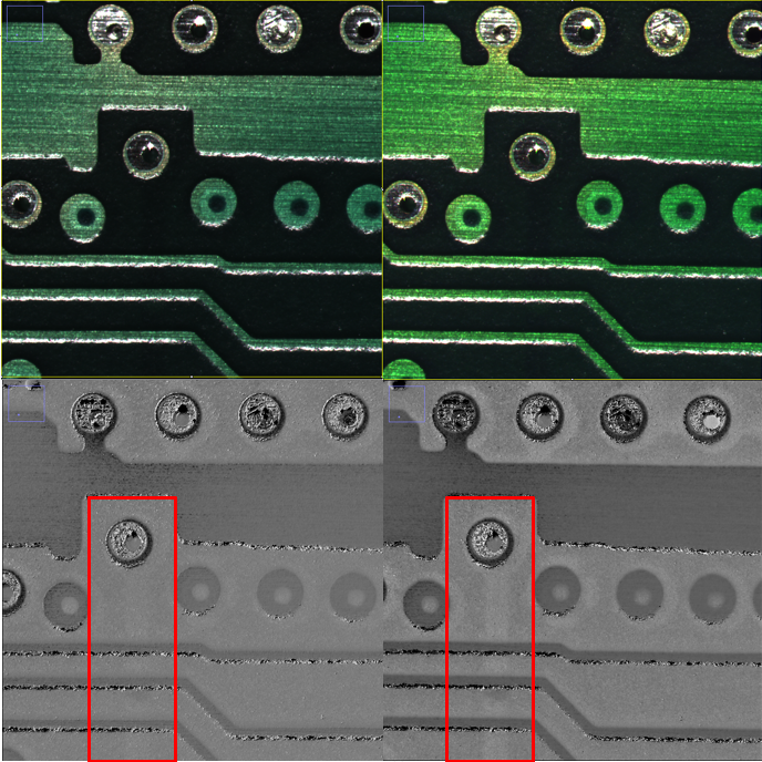 이렇게 Multifield™ 기술을 멀티필드 이미징으로 이용한다면 디스플레이나 배터리 등의 표면 외관 검사에서 다양하게 활용할 수 있다. Multifield™ 기술를 컬러 이미징으로 사용한다면 적은 색변화에도 더 민감하게 반응할 수 있기 때문에 컬러를 이용한 PCB 등의 얼룩, 이물, 불량 검사에 활용할 수 있다는 장점을 갖고 있다.