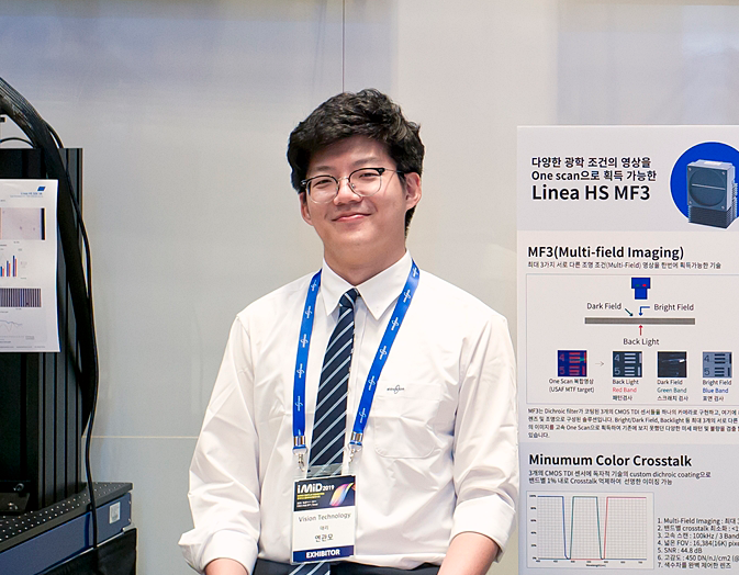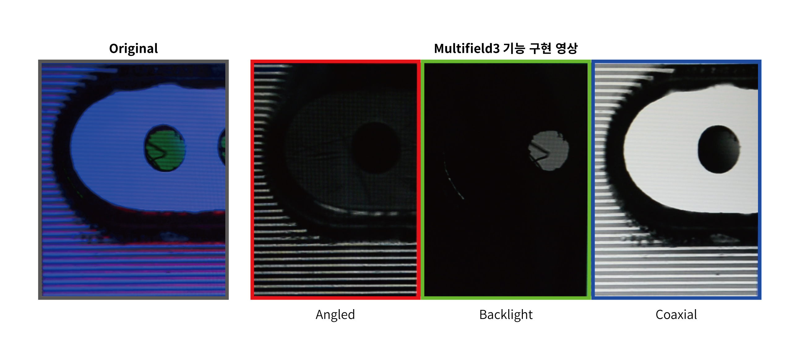 멀티 필드 이미징을 사용할 때 color crosstalk이 발생한다고 가정해보자. Color crosstalk가 발생한다면 각 채널 별로 원하는 이미지 이외의 다른 조명에 의한 이미지도 함께 들어오기 때문에 이미지 contrast가 떨어지는 현상이 발생할 것이다. 이 때 Multifield™ 기술을 적용한 카메라에 적합한 파장의 조명을 사용하면 color crosstalk을 최소화하고, 광량도 최대한 확보 가능하다. Bright field, Dark field, Back light의 세 가지 완전히 다른 조명을 사용할 수도 있고, 반사 조명 각도가 각각 다른 3가지 조명을 사용하여 한 번 스캔으로 다양한 불량을 검출할 수 있다.