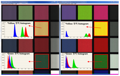 위의 이미지는 일반 컬러 카메라와 Multifield™ 기술을 적용한 카메라의 컬러 테스트 이미지다. Yellow와 Green 영역의 히스토그램을 보면 R, G, B별로 crosstalk이 확연히 차이 나는것을 볼 수 있고, 특히 2가지 색이 섞이는 지점에서는 Multifield™ 기술에서 불필요한 타 색깔의 간섭이 없는 것을 확인할 수 있다. 이는 실제 타겟의 색상이 조금만 변화하더라도 Multifield™ 기술을 적용한 카메라에서는 RGB 컬러 비율의 차이가 발생하는 것을 의미한다 즉, 기존 컬러 라인 스캔 카메라에서 보지 못했던 특정 컬러 간 차이들을 명확히 구분할 수 있다.