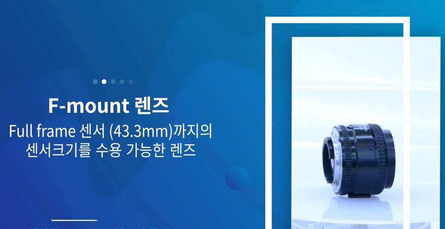 두번째로 F-mount는 여러가지 규격을 가지고 있는데, 그 중 Nikon사의 F-mount가 일반적으로 많이 쓰이고 있습니다. 이 F-mount는 Full frame 센서 사이즈, 즉 43.3mm 정도 까지의 센서크기를 수용 가능합니다.