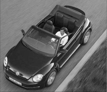 아래의 그림과 같이 파란색의 셔츠를 입은 남자가 붉은색의 스포츠카를 타고 녹색의 수풀 옆을 달리고 있습니다.