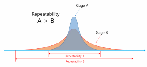 Repeatability는 반복 정밀도라고 하며, 짧은시간 내에 하나의 장비로 하나의 샘플을 한 명의 작업자(Appraiser)가 동일한 프로세스로 반복 측정했을 때, 측정 값의 최대 편차로 정의됩니다. 측정 값의 편차가 작을수록 정밀하다고 하며, 이는 정확도와는 무관합니다. Repeatability는 Equipment Variation(EV) 이라고 해서, 전체 시스템의 불확실성(Uncertainty)에서 장비 자체의 영향을 분석하기 위해 측정 됩니다.