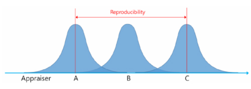 Repeatability는 재현성이라고 하며, 하나의 장비로 하나의 샘플을 다수의 작업자가 동일한 프로세스로 반복 측정 했을 때, 다수의 작업자 간 평균 값의 최대 편차로 정의됩니다. 즉, 아래 그림과 같이 A, B, C 세 명의 작업자가 측정한 결과에서 최소 평균과 최대 평균의 차이가 Reproducibility로 정의 됩니다. Reproducibility는 Appraiser Variation이라고 해서, 전체 시스템의 불확실성(Uncertainty)에서 작업자에 의한 영향을 분석하기 위해 측정 됩니다.